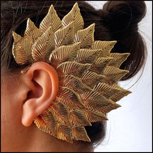 金色の葉をいくつも重ね合わせたゴージャスで存在感のあるイヤーフック。あまりの大きさのため、デザインの真ん中にクリップが付いていますので、ヘアピンのように髪に固定すれば、ホールドもばっちり!クリップなので洋服につけても綺麗。