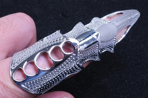 先端部と根元の部分のセンターにエッジのきかせた鶏冠(トサカ)のようなフォルムがハードさを演出したアーマーリングです。