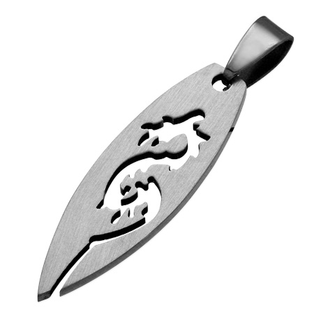 サーフボード形のステンレスプレートに竜をモチーフにしたトライバルをカットアウトしたクールなペンダントトップ。